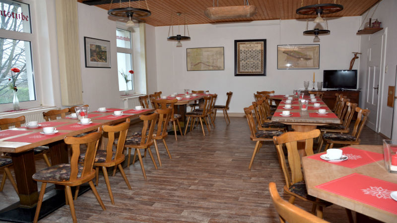 Es stehen 5 Tische für 6 Personen und 1 Tisch für 4 Personen zur Verfügung, die auch beliebig kombinierbar sind. Bei Bedarf können weitere Tische und Stühle zugestellt werden.